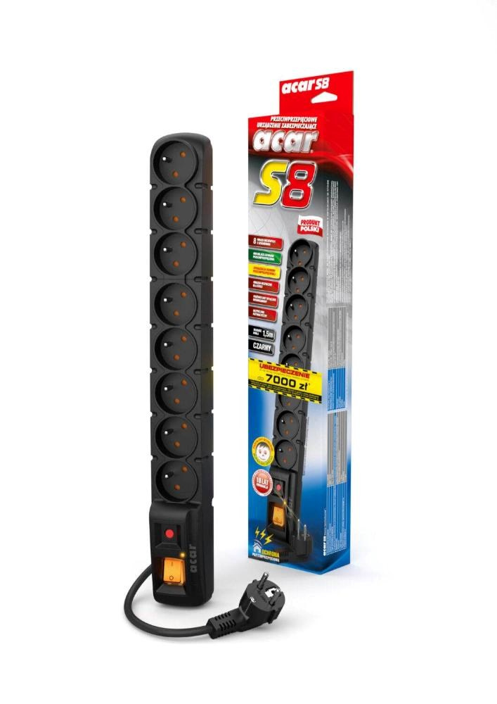 Acar S8 1.5m kabel, 8 zásuvek, přepěťová ochrana, černá