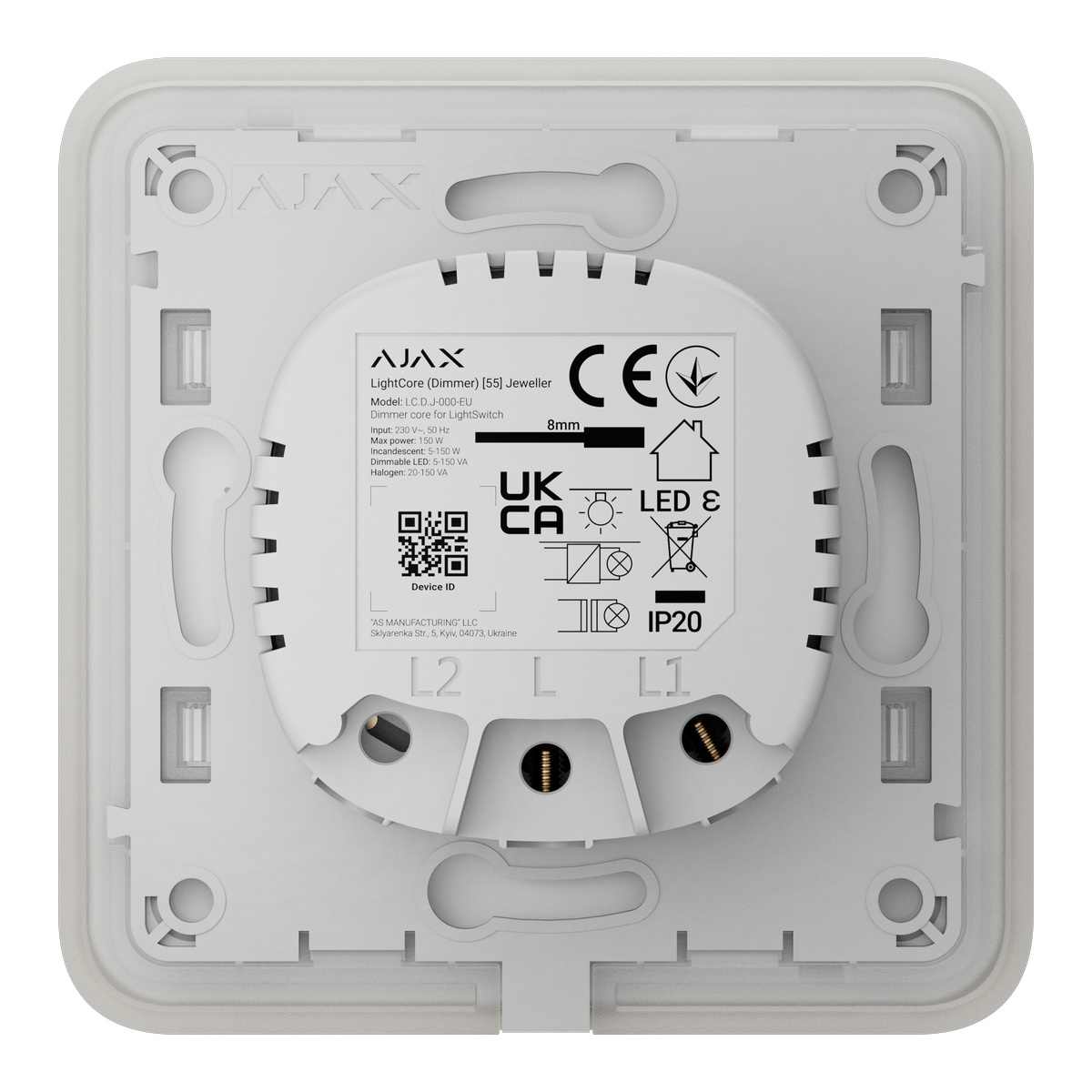 Ajax LightSwitch Dimmer Jeweller je chytrý dotykový nástěnný stmívač pro osvětlení určený pro vnitřní instalaci.