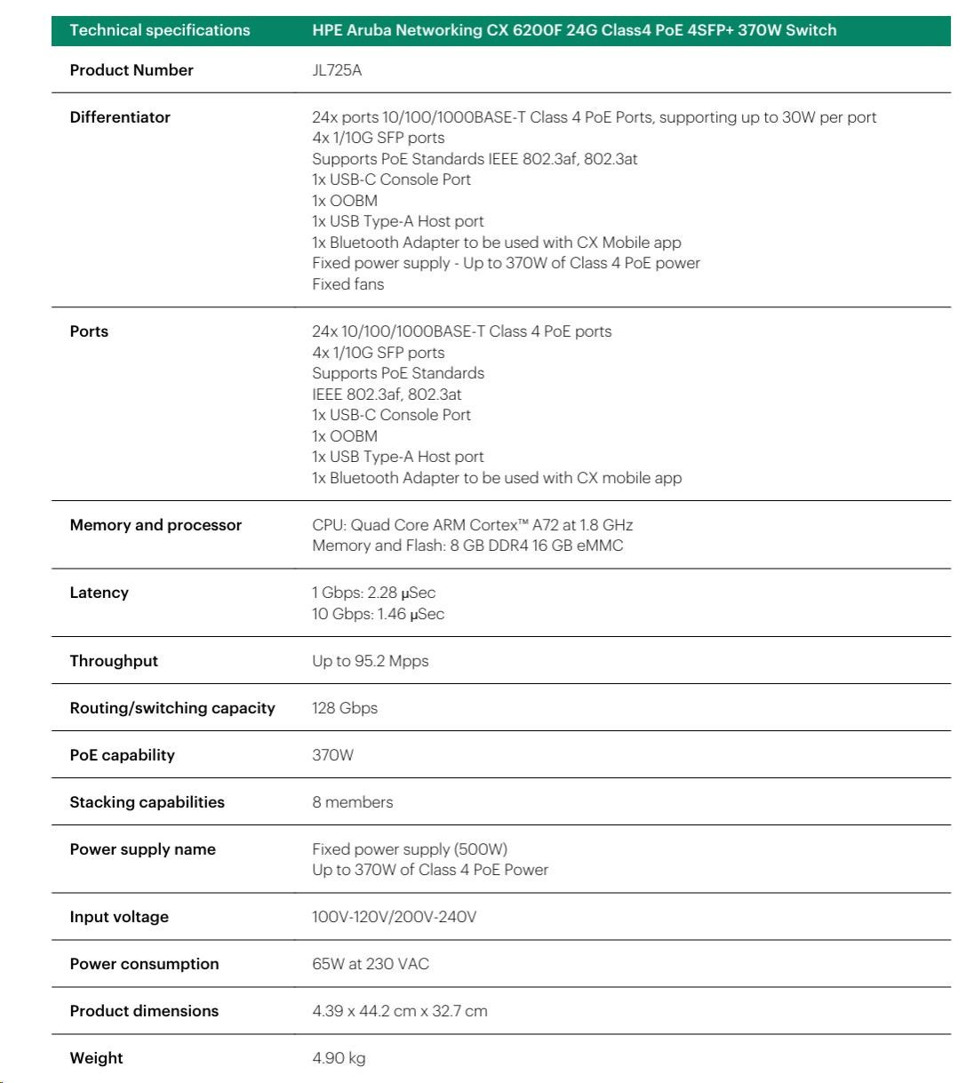 Popis HPE Aruba Networking CX 6200F 24G Class4 PoE 4SFP+ 370W Switch JL725A RENEW