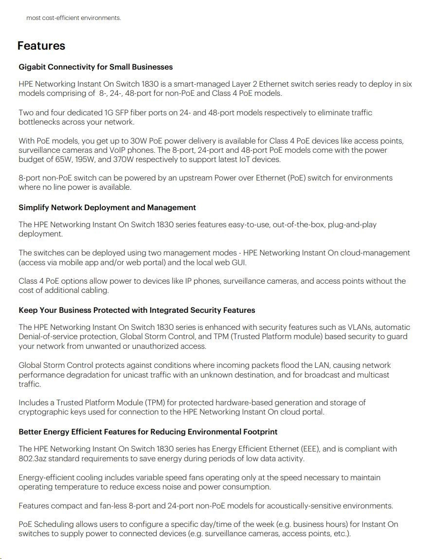 | Aruba Instant On 1830 8G Switch (JL810A) | Aruba Instant On 1830 8G 4p Class4 PoE 65W Switch (JL811A) | Aruba Instant On 1830 24G 2SFP Switch (JL812A) | Aruba Instant On 1830 24G 12p Class4 PoE 2SFP 195W Switch (JL813A) | Aruba Instant On 1830 48G 4SFP Switch (JL814A) | Aruba Instant On 1830 48G 24p Class4 PoE 4SFP 370W Switch (JL815A) | ||||