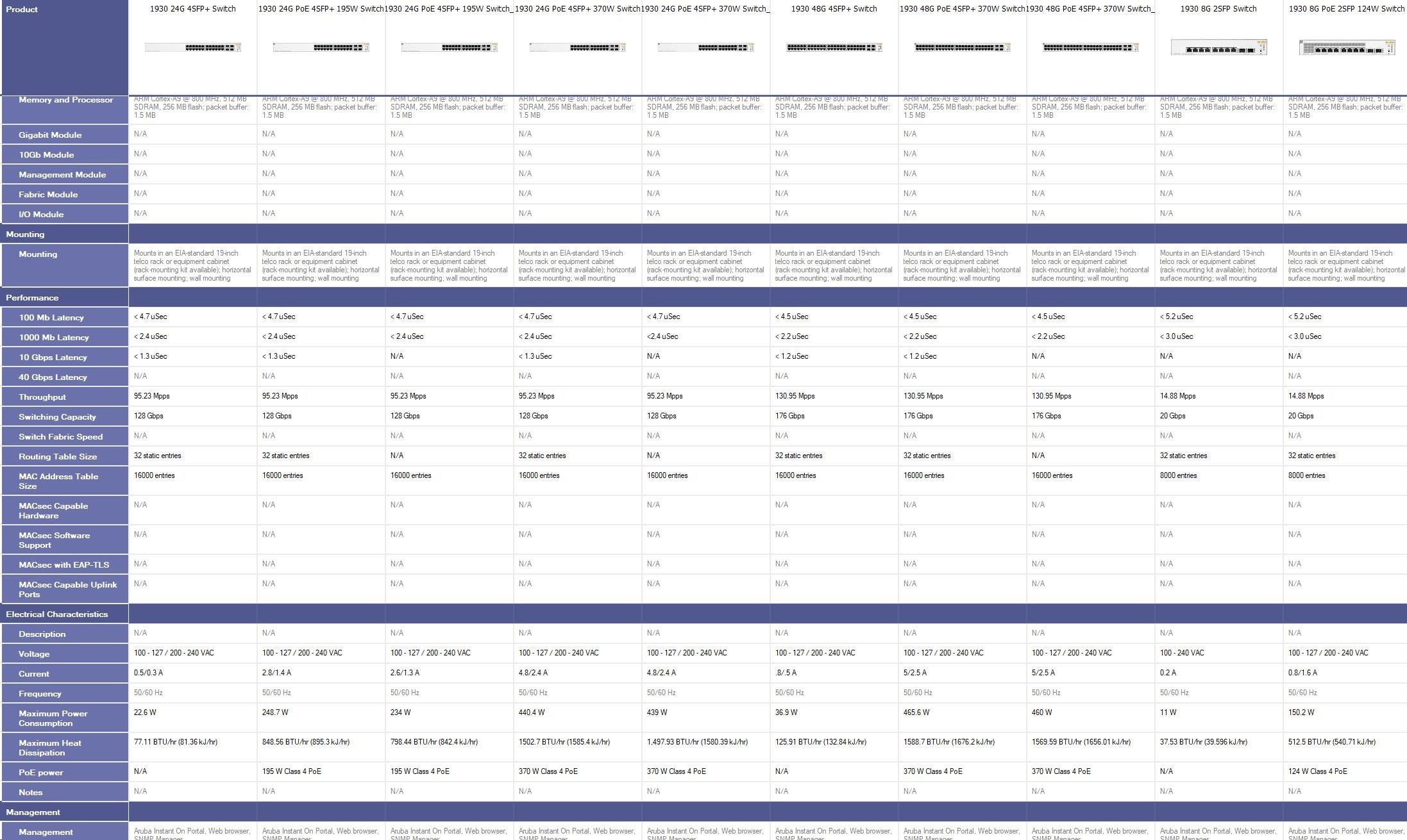 Notes: 1Acoustics measured in 23°C semi-anechoic chamber with a loading of 100% traffic and 50% PoE on all ports. Measured in accordance with ISO 7779. Declared in accordance with ECMA-109:2010. Values presented are the Declared A-Weighted Sound Power Level (LWAd) and the mean Bystander A-Weighted Sound Pressure Level (LpAm)