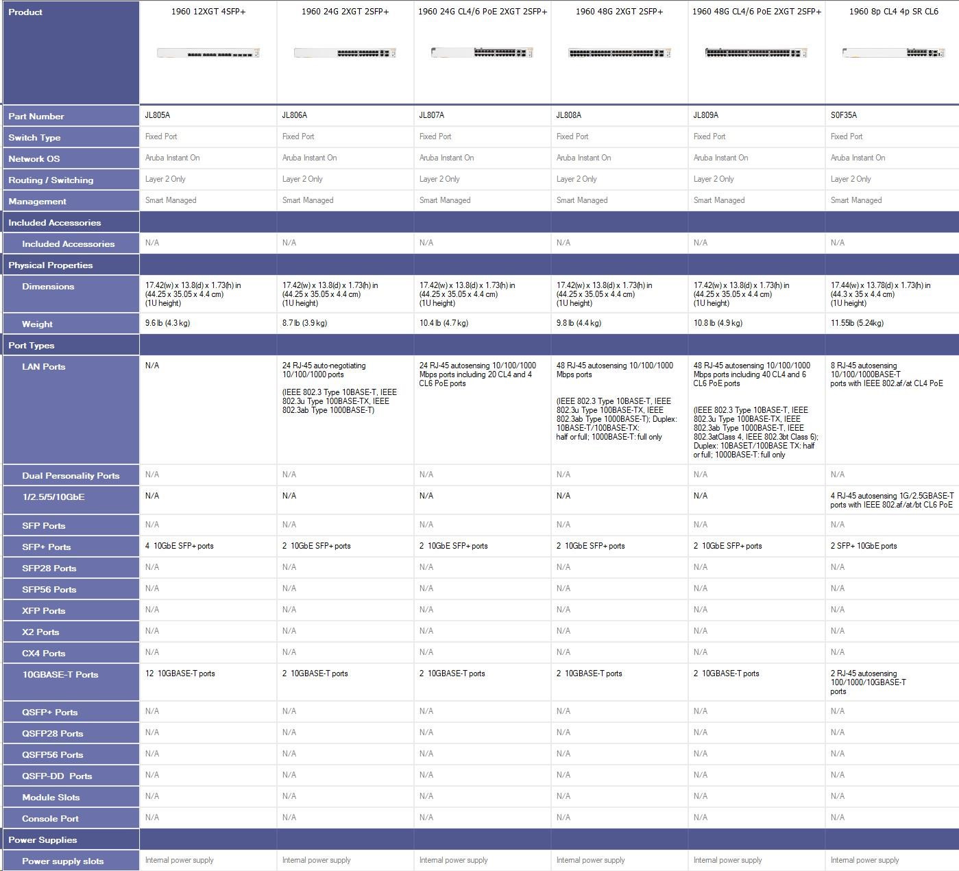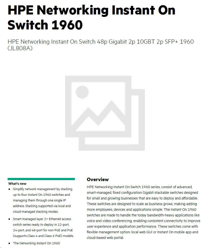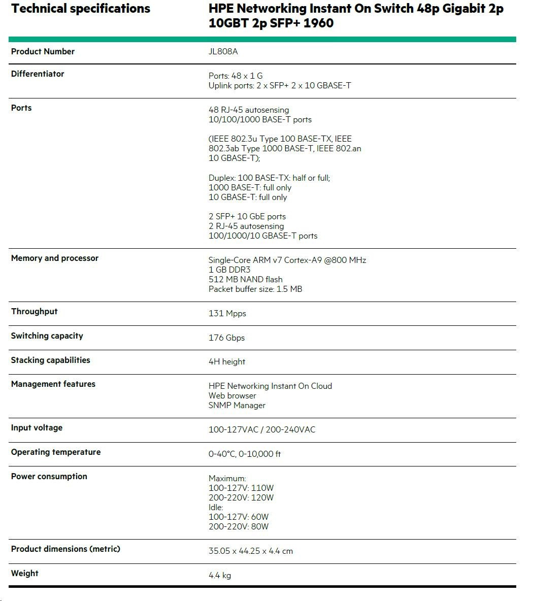 1960 Provedení:Desktop, Rack mounted 19"; Funkce:QoS (Quality of service), VLAN (virtual local area network), DHCP snooping, Stohovatelnost, L2, Web management/Smart switch, VPN; Technologie:Gigabit Ethernet + 10 GbE porty; Počet portů LAN:48; Počet portů LAN:48; Přenosová rychlost LAN (Mb/s):131; Přenosová rychlost LAN (Mb/s):131; Počet SFP portů:4.Více