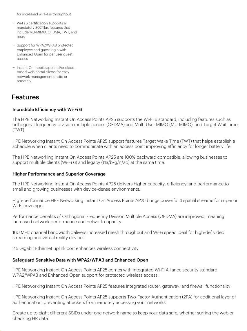 | Ultra-high-speed performance for high-density small businesses. Perfect for gaming, boutique hotels, tech start-ups and professional offices. The rise of the remote and hybrid workplace has placed increased pressure on business networks. Existing Wi-Fi infrastructure is struggling to support the explosion of devices and bandwidthhungry applications - all contributing to spotty video calls and sluggish download speeds. The Aruba Instant On AP25, a 4x4 Wi-Fi 6 access point, is designed to meet the increasing volume of connected devices. Delivering superior performance, coverage, and speed at a competitive price, the AP25 is the perfect access point for small and growing businesses. The Wi-Fi Certified 6TM AP25 delivers faster Wi-Fi speeds, greater capacity, and reduced latency between access points and devices for a superior Wi-Fi experience. AP25 improves efficiency and reduces congestion for networks with many connected devices, making it ideal for high-density environments. And with 4x the capacity of 802.11ac access points, the AP25 provides exceptional user experience, allowing businesses to serve more customers with higher speed and less congestion. Features of the AP25 include orthogonal frequency-division multiple access (OFDMA), multi-user MIMO and target wake time (TWT). With up to 4 spatial streams (4SS) and 160MHz channel bandwidth (HE160), the AP25 provides groundbreaking wireless capabilities for businesses looking to boost performance and future-proof their networks. |