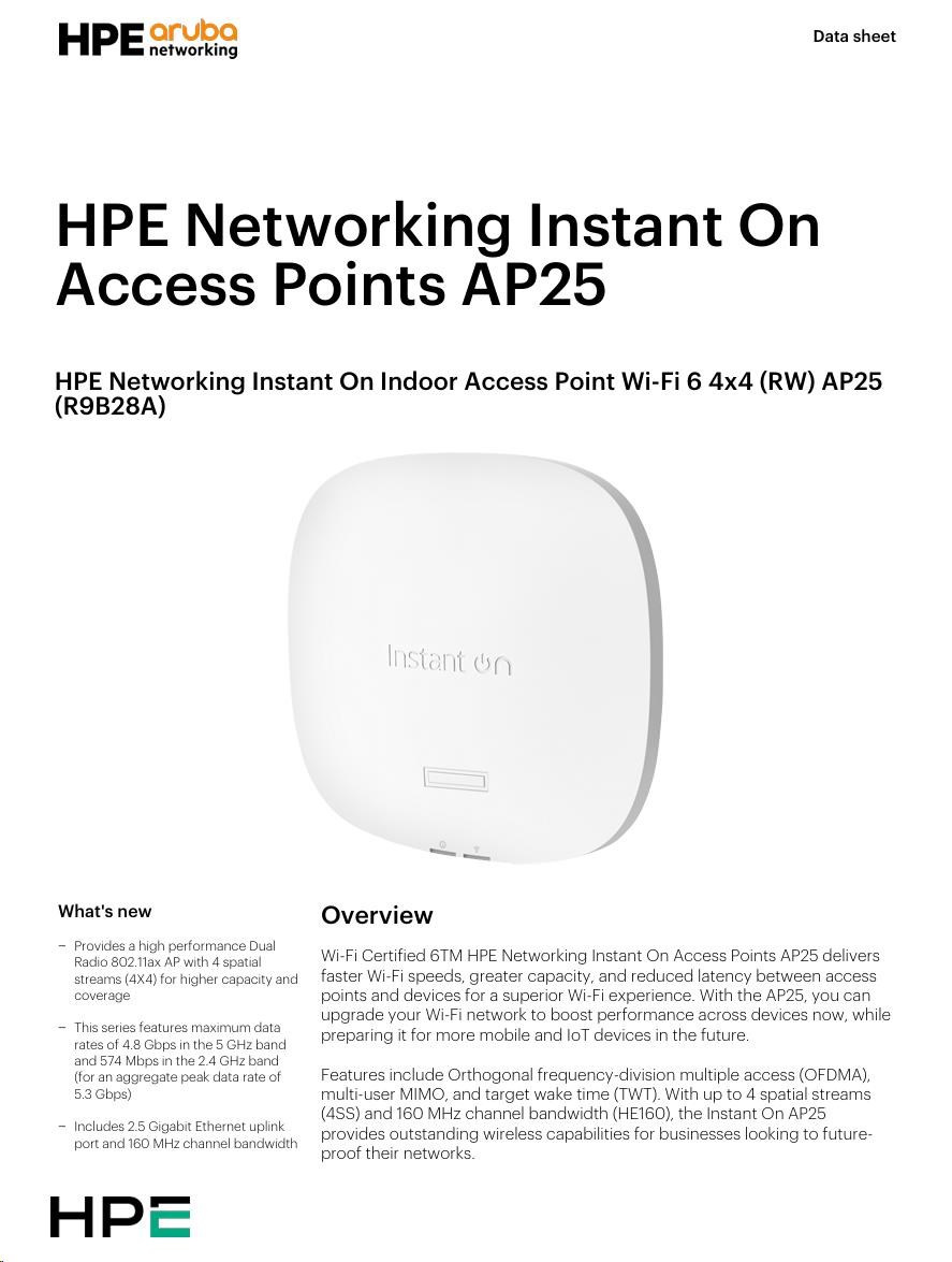 HPE Networking Instant On Indoor Access Point Wi-Fi 6 4x4 (RW) AP25 (R9B28A)