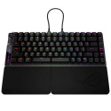 Herní klávesnice ROG Falcata 75 % s rozdělenou klávesnicí, magnetickými spínači ROG HFX V2 s možností výměny za provozu a snímačem ROG Hall Sensor; vybavená přepínačem Rapid Trigger, intuitivním ovládáním a multifunkčním kolečkem, třírežimovým připojením s bezdrátovou technologií ROG SpeedNova 8K, režimem Zone Mode, čtyřvrstvým tlumení a odnímatelnými silikonovými opěrkami zápěstí