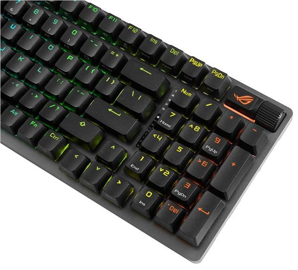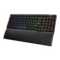 Bezdrátová herní klávesnice ROG Strix Scope II 96 s připojením ve třech režimech, klávesové zkratky pro streamování, multifunkční ovládací prvky, mechanické spínače ROG NX s možností výměny za provozu, stabilizátory klávesnice ROG, krytky kláves PBT doubleshot a silikonová tlumicí pěna, tři úhly sklonu a opěrka zápěstí