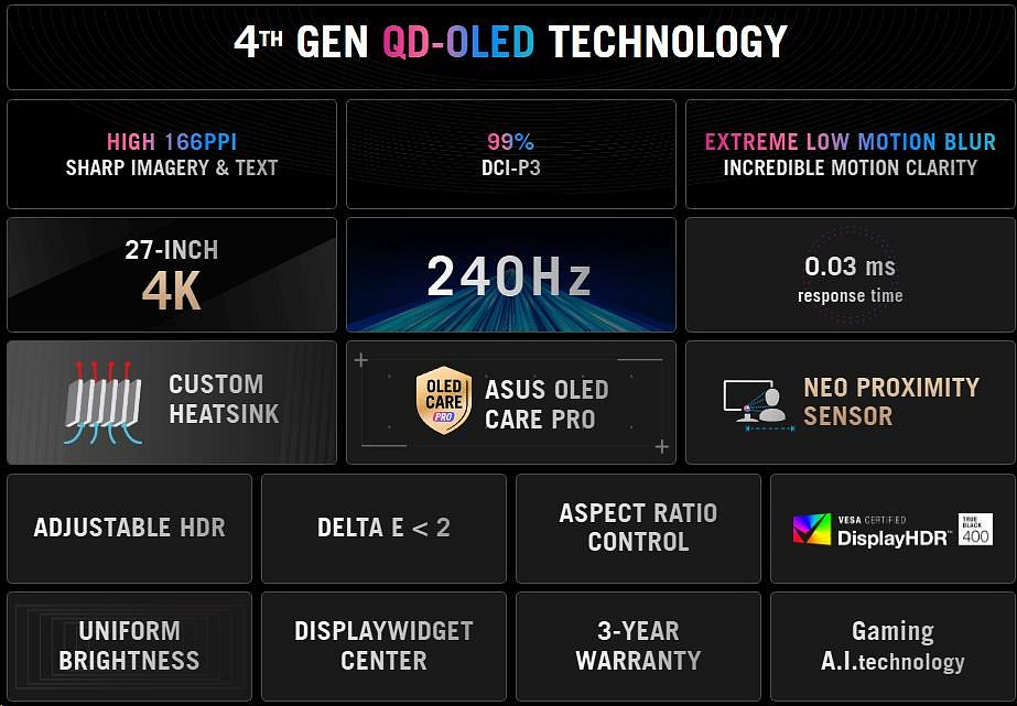 Herní monitor ROG Strix OLED XG27UQDMS – 27 palců (26,5 palců viditelná plocha) 4K (3840 x 2160) Tandemový panel QD-OLED, 240 Hz, 0,03 ms (GTG), kompatibilní s G-SYNC®, vlastní chladič, senzor Neo Proximity, rovnoměrný jas, 99 % DCI-P3, OLED Care Pro, ASUS DisplayWidget Center
