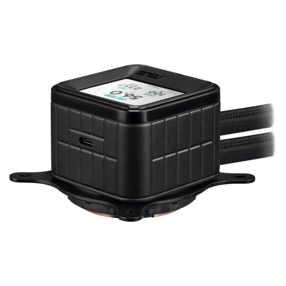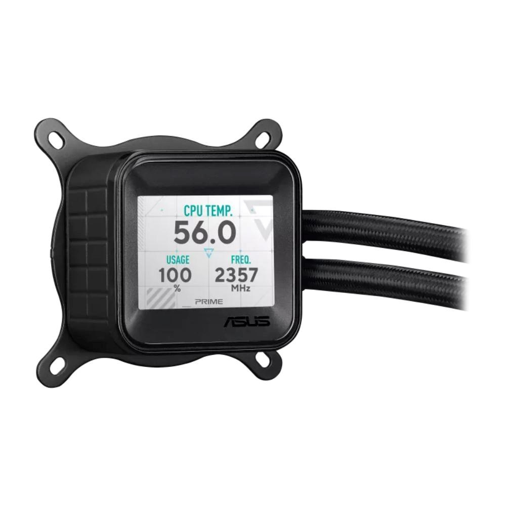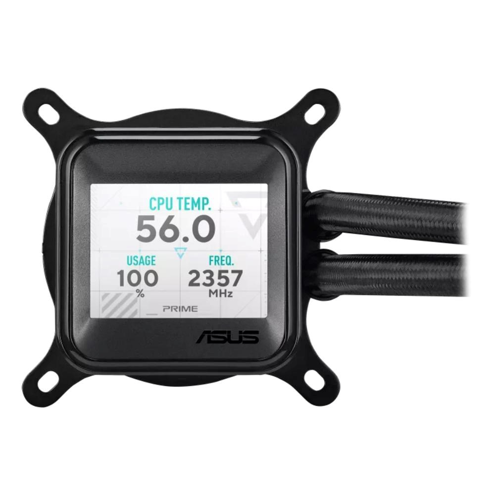 All-in-one vodní chladič procesoru ASUS Prime LC ARGB LCD s ostrým displejem zobrazujícím informace o procesoru a grafické kartě s různým pozadím, vysoce výkonným čerpadlem Asetek vybaveným robustním motorem a ventilátory s možností řetězení.