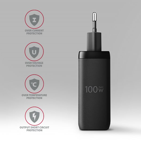 Pokročilý systém ochran na výstupu nabíjecího adaptéru chrání nabíjené zařízení před poškozením. Funkce nabíječky také zajistí rozpoznání nabíjeného zařízení a zvolení optimální rychlosti a průběhu nabíjení.
