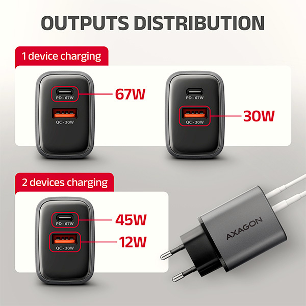 Cestovní nabíječka do sítě AXAGON ACU-PQ67 GaN umožňuje rychlé nabíjení až dvou mobilních zařízení současně. Díky celkovému výkonu 67W dokáže nabíječka dobíjet notebooky, tablety, telefony a další mobilní zařízení nejvyšší možnou rychlostí. Adaptér nabízí nejen standardní USB-A konektor, ale také oboustranný USB-C konektor.