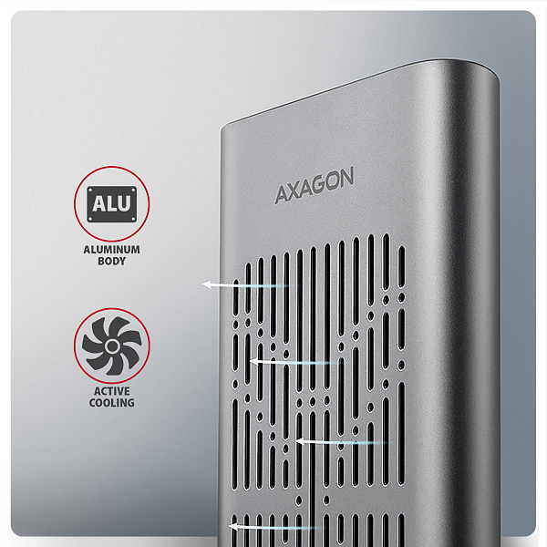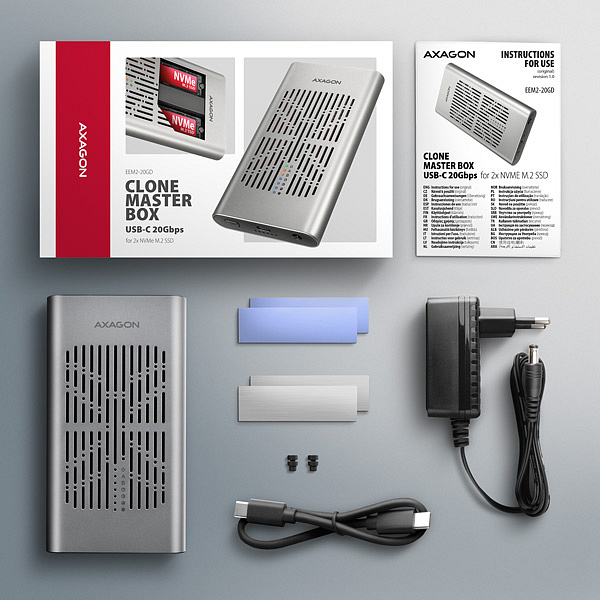 Popis AXAGON EEM2-20GD, USB-C 20Gbps externí box pro dva M.2 NVMe SSD s funkcí klonování