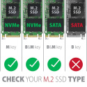Unikátní vlastností, díky novému čipsetu, je možnost použití jak M.2 NVMe tak i SATA disků. Nemusíte tak přemýšlet jaký typ M.2 disku do boxu vložíte. Výhodou je uchycení rovnou pro tři různé délky SSD karet - 42, 60 a 80 mm. M.2 karty mohou být jednostranné nebo oboustranné. Box nemá omezení kapacity vloženého SSD disku.