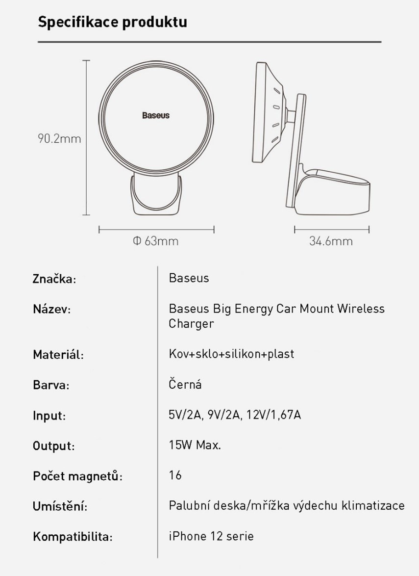 Kvalitní a elegantní magnetický držák mobilního telefonu s?bezdrátovým nabíjením, který je kompatibilní s?řadou iPhone 12 vybavených MagSafe. Samozřejmostí je retail balení.