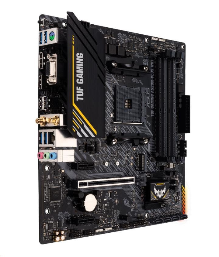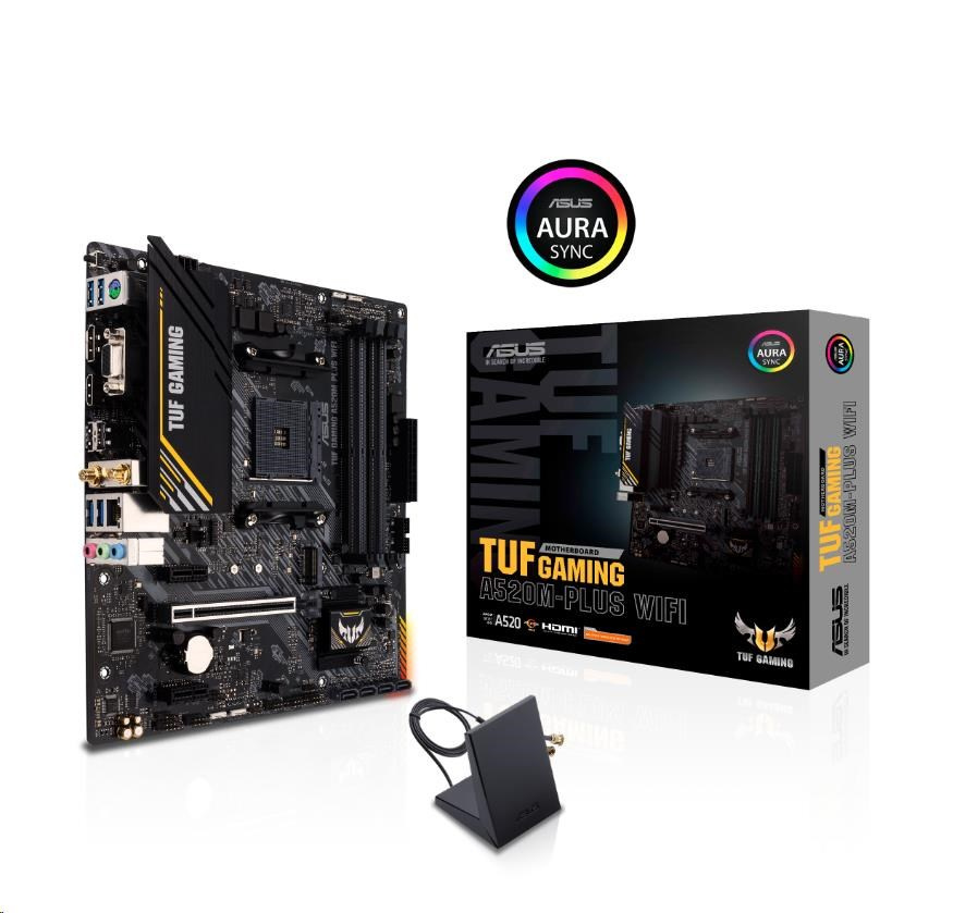 AMD A520 (Ryzen AM4) micro ATX gaming motherboard with M.2 support, 802.11ac Wi-Fi, DisplayPort, HDMI, D-Sub, USB 3.2 Gen 1 ports, SATA 6 Gbps, and AURA Addressable Gen 2 headers.