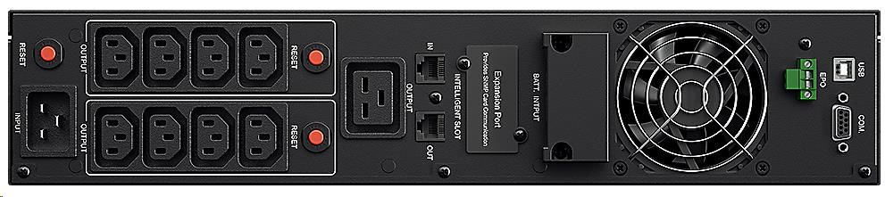Počet výstupních zásuvek:9; Použití:Server; Provedení:Tower, Tower/Rack; Zdánlivý výkon VA:3000; Výška v Racku:2U; Topologie:On-Line; Fáze (Vstup/Výstup):1:1; Komunikace:USB, RS232; Možnosti:Volitelně Management karta, Prodloužení záložního času, EPO konektor; Typ výstupu:IEC 13, IEC 19.Více