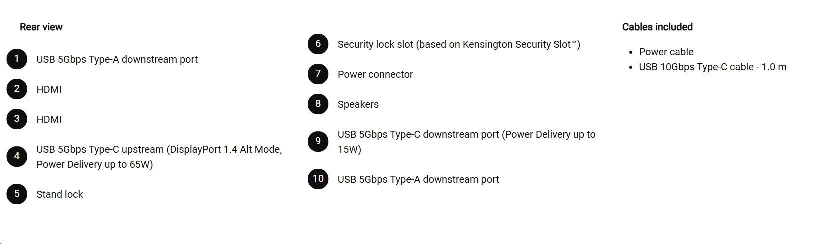 USB port - 1 USB-C 5Gbps upstream port (DisplayPort 1.4 Alternate Mode, Power Delivery up to 65 W) (Supports up to 3440 x1440, 120 Hz, HDR, AdaptiveSync)