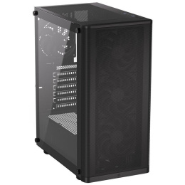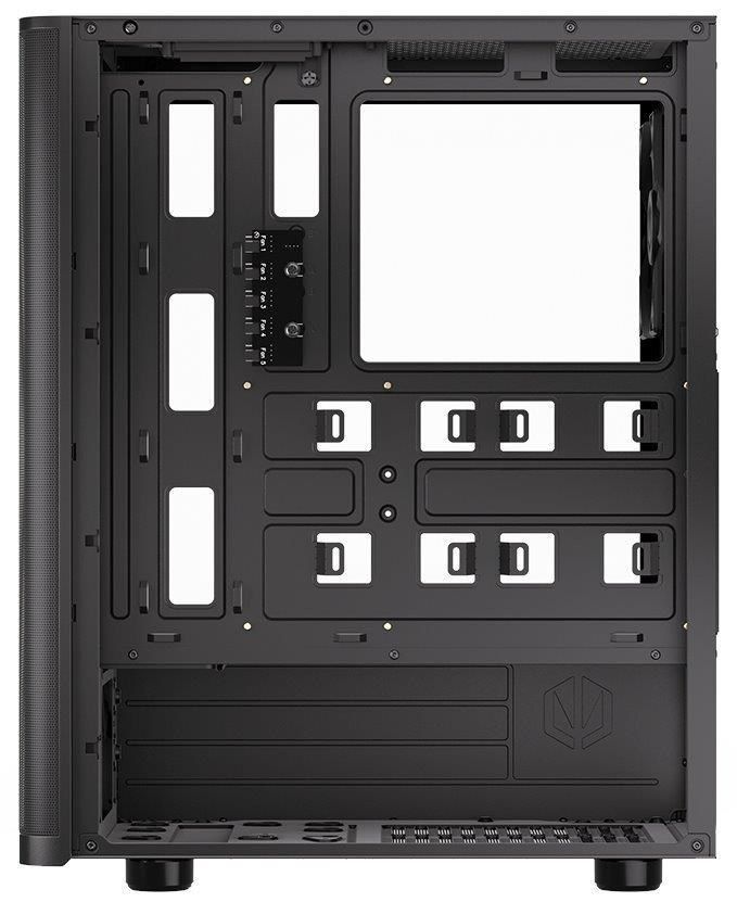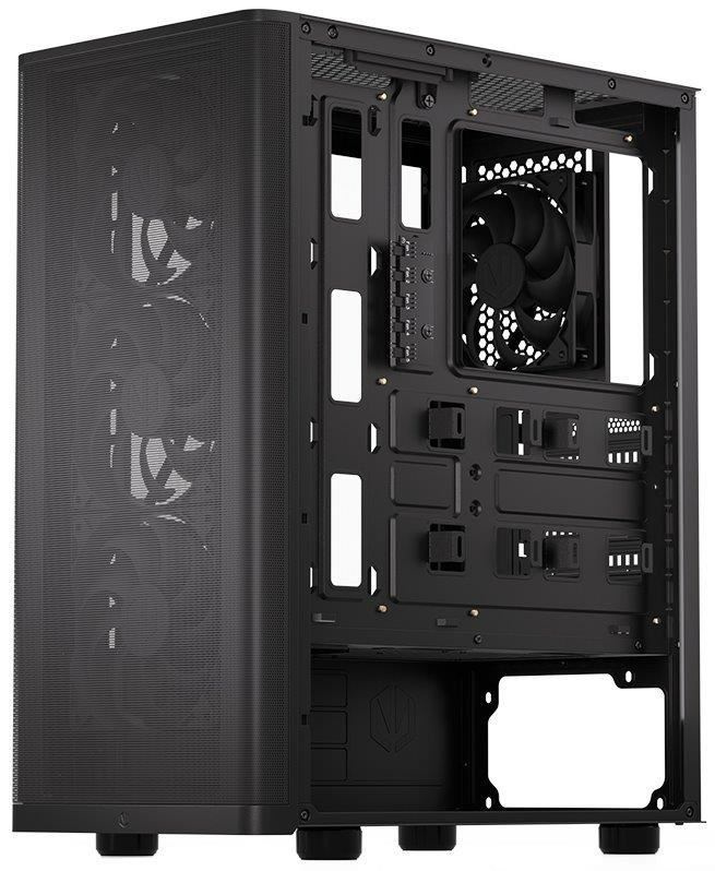 Skříň formátu Middle Tower s průhlednou bočnicí z tvrzeného skla nabízí dvě 2,5" pozice pro SSD disky a jednu 3,5" pozici pro pevný disk. Na horní části se nachází dva USB 3.0 porty, sluchátkový výstup a audio vstup pro mikrofon. Vybavena je čtyřmi 120 mm ventilátory, které spolu s perforovaným čelním panelem zajišťují dostatečné proudění vzduchu. Důmyslné řešení umožňuje pohodlné umístění až 360 mm dlouhého výměníku vodního chlazení na přední straně. Ve skříni je dostatek prostoru pro chladič CPU do výšky až 161 mm a grafickou kartu o délce až 315 mm. Dodávána je bez zdroje. Součástí je také sada prachových filtrů.
