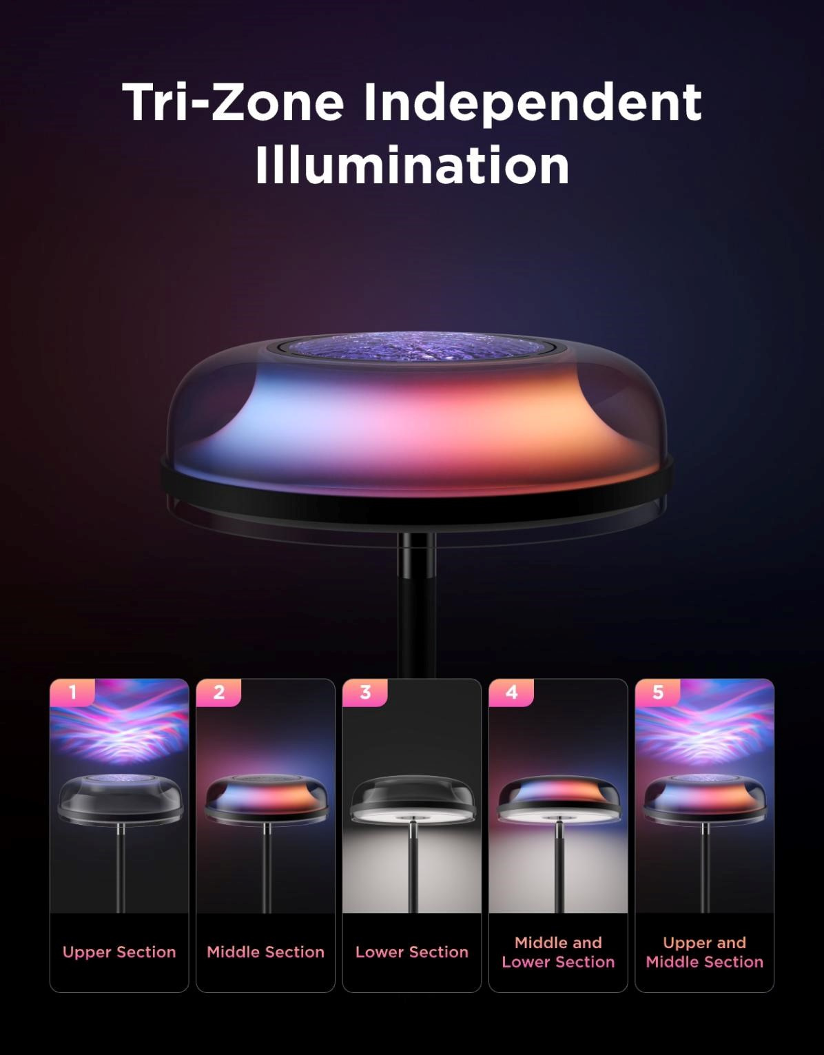 Spodní LED zóna poskytuje jasné a kvalitní bílé světlo až 1000 lumenů, vhodné pro čtení, práci nebo každodenní aktivity. Díky kombinaci teplého a studeného světla můžete přesně nastavit tón osvětlení podle nálady. Tento výkon zajišťuje, že lampa je zároveň praktická i stylová.
