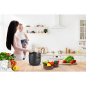Elektrický tlakový hrnec už není strašákem, po skončení programu jednoduše upustíte bezpečně tlak pomocí One Touch ventilu. Zpracování přístroje v originálním prémiovém High end designu zaručuje nejen tu nejvyšší kvalitu použitých materiálů, ale také velmi snadnou údržbu díky nepřilnavému povrchu vnitřního hrnce o objemu 5 l. Začátky s novým spotřebičem usnadní inspirativní kuchařka s osmi zdravými recepty, která je součástí balení.