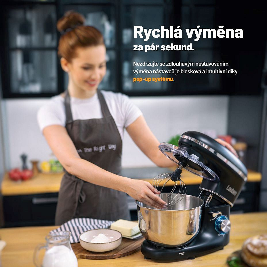 Vaření a pečení se stane ještě větší zábavou, s víceúčelovým kuchyňským robotem Lauben Kitchen Machine 550BC o výkonu 1400 W vše zvládnete snadno a rychle. Netřeba se bát ani přípravy tužších těst, celokovové převody si s vysokou zátěží poradí. Mísa o objemu 5,5 l z nerezové oceli pojme opravdu hodně a víko brání úniku obsahu při zpracování. Suroviny lze během provozu přidávat skrze plnicí otvor ve víku. Při všem, co dokáže, je robot menších rozměrů a nezabere tak na lince příliš místa. Svým designem ji však bude i zdobit. Přístroj pohodlně ovládáte jednou rukou díky One Touch systému, manipulaci usnadňuje také Pop-up systém sloužící k výměně nástavců. Robot disponuje hned několika nástavci, pro míchání, šlehání či hnětení a ke každému z nich naleznete v balení chutný recept pro inspiraci.