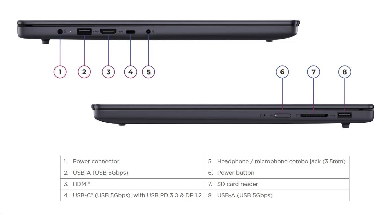 USB Type-C, HDMI, 3.5mm Jack, SD karta, USB 3.2 Gen 1