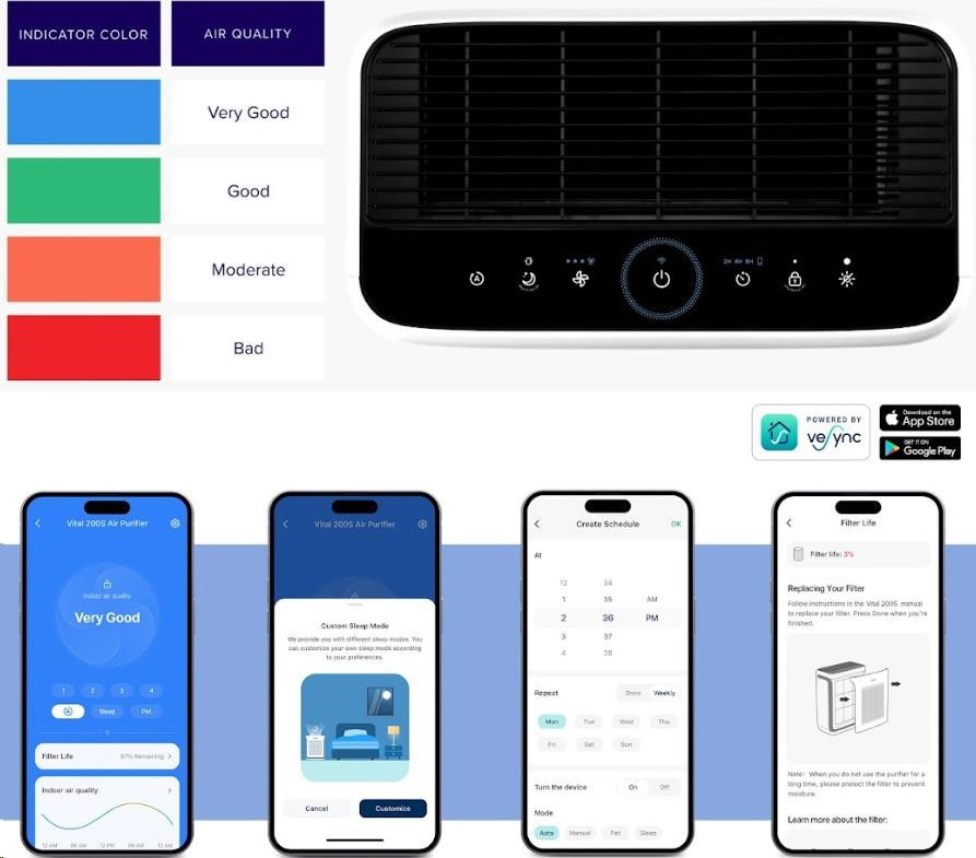 Chytrou čističku vzduchu Levoit Vital 200S PRO můžete ovládat přímo na displeji nebo také přes aplikaci určenou pro smartphony a tablety Android a Apple. V aplikaci si můžete nastavit různé režimy, výkon, sledovat proces čištění, úroveň znečištění vzduchu nebo kondici, v jaké se filtr nachází. Ovládaní hlasem je možné přes Alexa a Google Assistant.