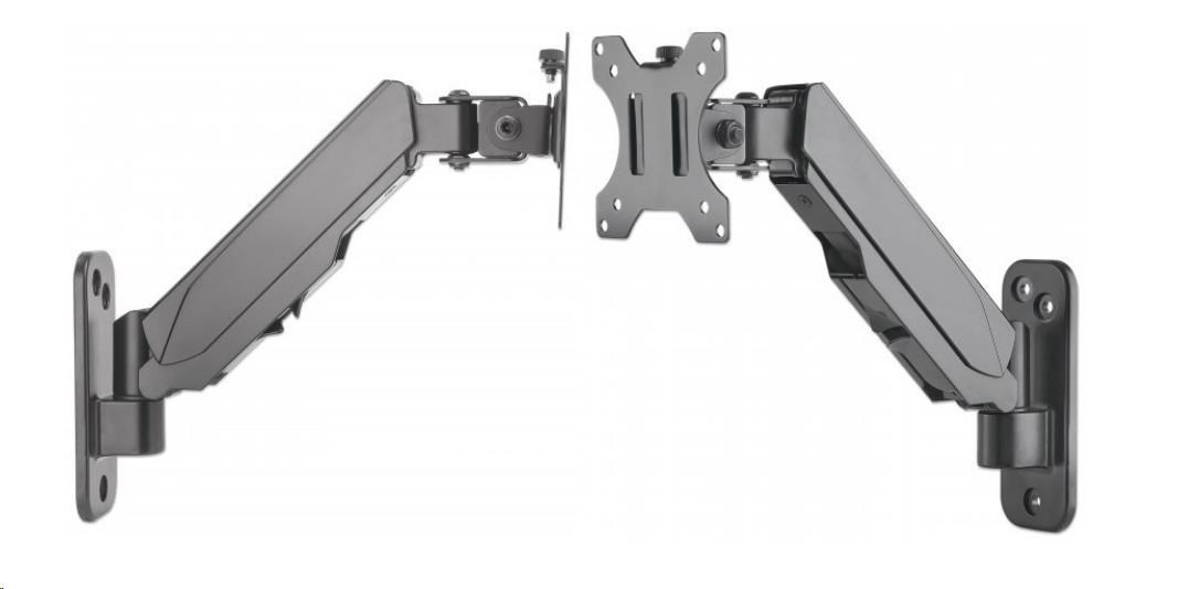 The Manhattan Universal Gas Spring Monitor Wall Mount offers a single-jointed gas-spring arm to securely hold one 17" to 32" TV or monitor. This mount's gas spring promotes easy movement of the monitor or TV to a more comfortable viewing angle with the lightest touch. Designed to be installed on the wall to give back much-needed desktop real estate, the Manhattan Universal Gas Spring Monitor Wall Mount provides more flexibility, reach, and overall enjoyment of whatever task is at hand.