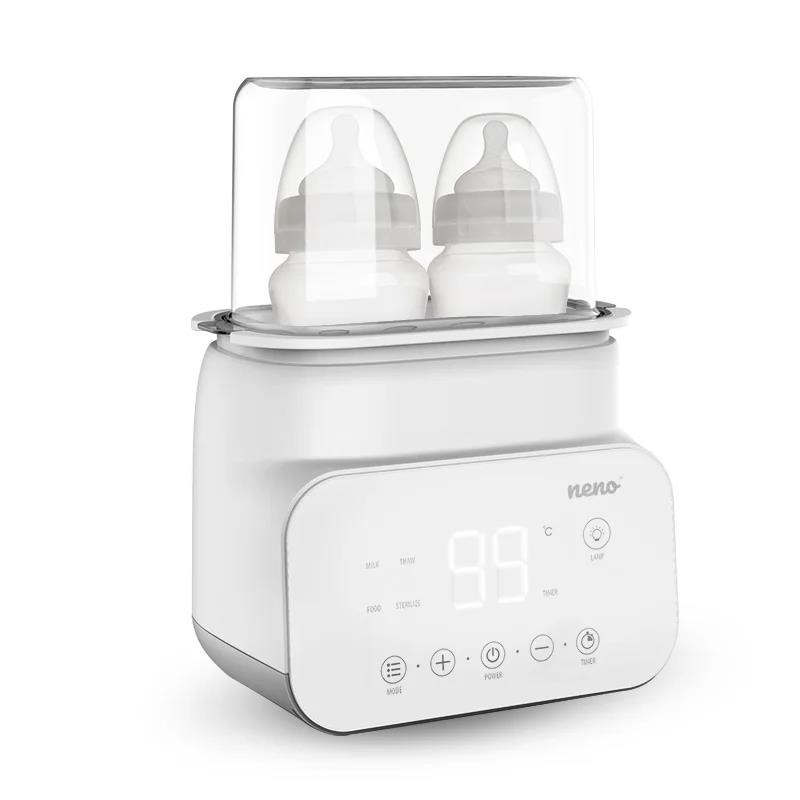 Neno Vita je vybavena funkcí sterilizace, která vám umožní udržovat lahve, kousátka nebo dudlíky hygienické a sterilní. Pomocí přiloženého sítka na láhve vyjměte předměty po sterilizaci bezpečně a pohodlně, abyste se nepopálili. Přístroj nejprve ohřeje vodu na 100 °C a poté lahve během pouhých 10 minut sterilizuje a připraví k použití. Zařízení má funkci ohřevu mléka, která umožňuje rychle a plynule ohřát mléko pro vaše dítě. Vše, co musíte udělat, je vybrat správnou teplotu v nastavení a začít ohřívat mléko. Naše zařízení má funkci rozmrazování, která vám umožní rychle rozmrazit pokrmy pro vaše dítě a ohřát je na vámi zvolenou teplotu, aby byly připraveny k podávání. Vita je vybavena funkcí ohřívání jídla, která umožňuje snadné a rychlé ohřívání jídla pro vaše miminko. Díky vestavěné funkci rozmrazování můžete rozmrazovat nejen hotová jídla a polévky, ale také tvrdé suroviny jako ovoce, zeleninu a další. Vše, co musíte udělat, je vložit mražené potraviny do nádoby a vybrat možnost rozmrazování na panelu displeje. Neno Vita má vestavěný noční osvětlovač, který vám umožní jej kdykoli použít. Lampa je instalována uvnitř sterilizátoru a jemně osvětluje víko sterilizátoru. Sterilizátor Neno Vita je vybaven zobrazovacím panelem, který umožňuje plynulou navigaci v přístroji a volbu vhodného nastavení podle vašich preferencí. Naše zařízení má vestavěný jasný displej, díky kterému se zařízení snadno a intuitivně používá. Neno Vita kombinuje 4 funkce: sterilizace, funkce ohřevu jídla a mléka a rozmrazování. Všechny tyto funkce spojené v jednom zařízení zaručují komfort používání a šetří místo v kuchyni. Naše zařízení má moderní a minimalistický design, přehledný LCD displej a velká navigační tlačítka, díky nimž je používání snadné a pohodlné..