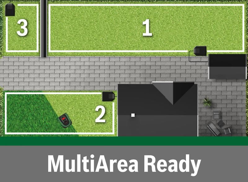 Díky funkci MultiArea poseče více travních ploch (až do 700 m2) a vypořádá se s úzkými průjezdy (75 cm mezi dráty).