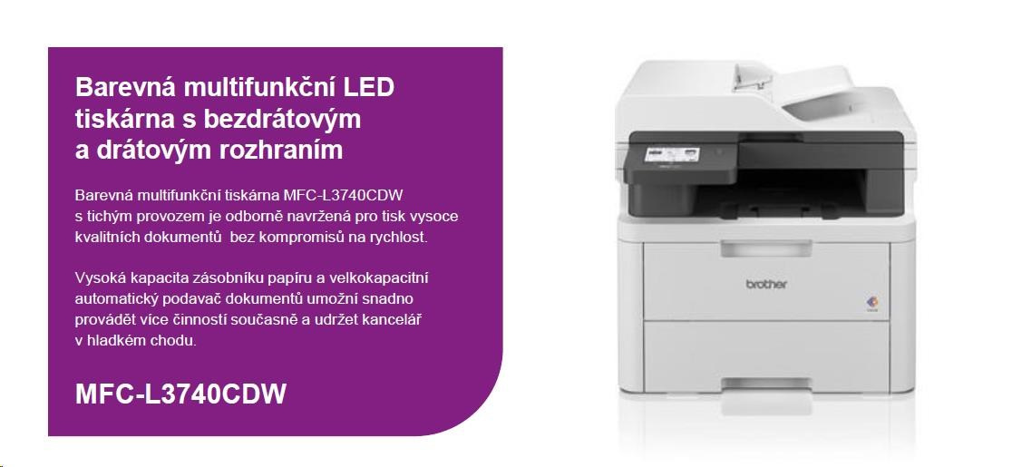 BROTHER multifunkce color LED MFC-L3740CDW - A4 18ppm 512MB 250listů USB WIFI LAN ADF50 duplex fax