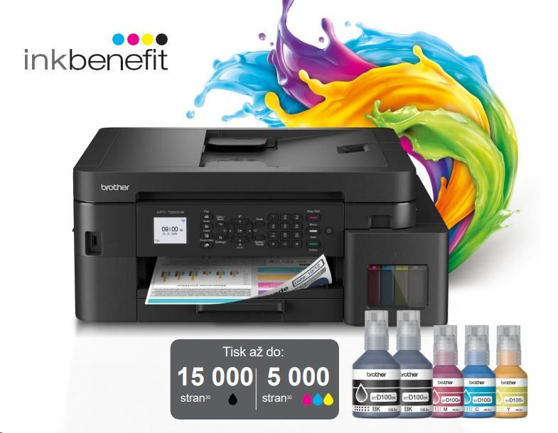 Kompaktní tiskárna vše v jednom MFC-T930DW tiskne déle s inkoustovými lahvičkami se super vysokou výtěžností, což snižuje náklady na barevnou stránku. Rychle naplňte nádržky během několika sekund, aniž byste museli držet lahvičky. Doplňování inkoustů je jednoduché a bez rizika jeho rozlití. Inovativní systém zámku lahviček zajišťuje, že vždy doplníte správnou barvu.