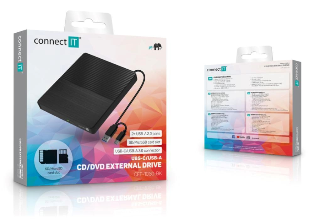 Pokud vlastníte notebook, ultrabook či netbook, je toto malé zařízení přesně to, co potřebujete. Můžete ho používat pro instalaci softwaru nebo k vytváření záloh. Externí CD/DVD SlimDrive vypalovačka CONNECT IT je napájena pomocí USB-C / USB-A portu, takže nepotřebujete žádný napájecí adaptér. Je jen o něco větší než DVD a snadno se vejde do kapsy batohu či brašny, můžete ji tedy vždy nosit s sebou.