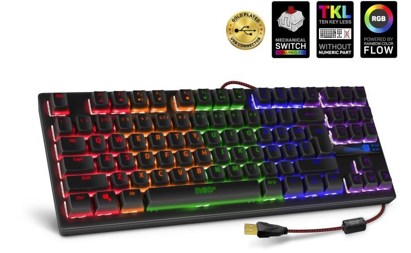 Kromě klasických herních funkcí, tato klávesnice disponuje mechanickými spínači OUTEMU RED s životností až 50 miliónů kliknutí a také je unikátní svým TKL (Ten Key Less) designem, který je bez numerické části a díky tomu vzniká na stole větší prostor pro pohyb myši na podložce. Další výhodou této klávesnice spočívá v její základně, vedou z ní totiž 3 drážky v různých směrech, díky kterým vám nebude překážet kabel od klávesnice. Samozřejmostí je u této série prémiový oplet přívodního kabelu a pozlacený USB konektor. V balení také naleznete arch 7 promo samolepek "NEO".
