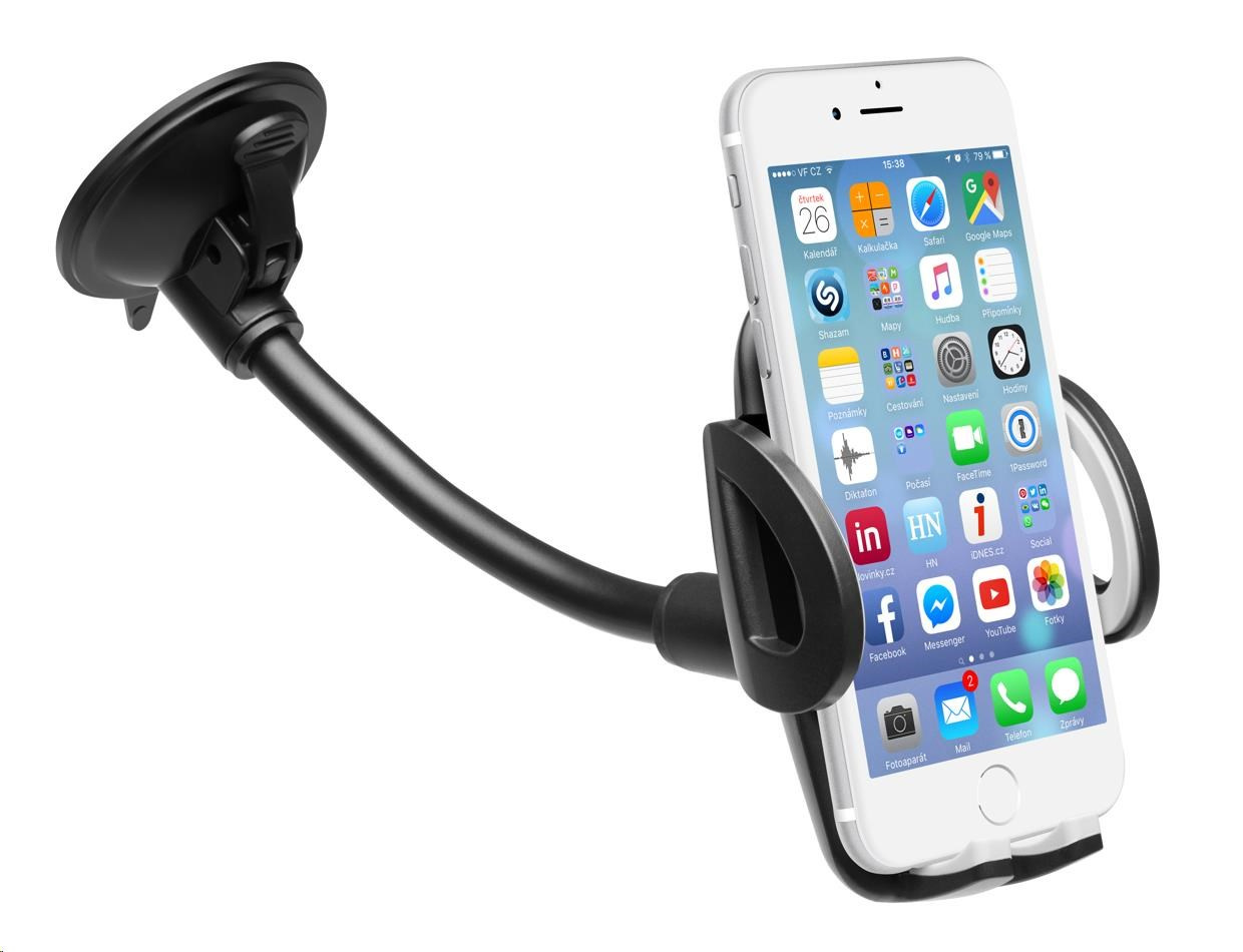 Univerzální držák do auta slouží k uchycení mobilního telefonu na sklo nebo palubní desku vozu.