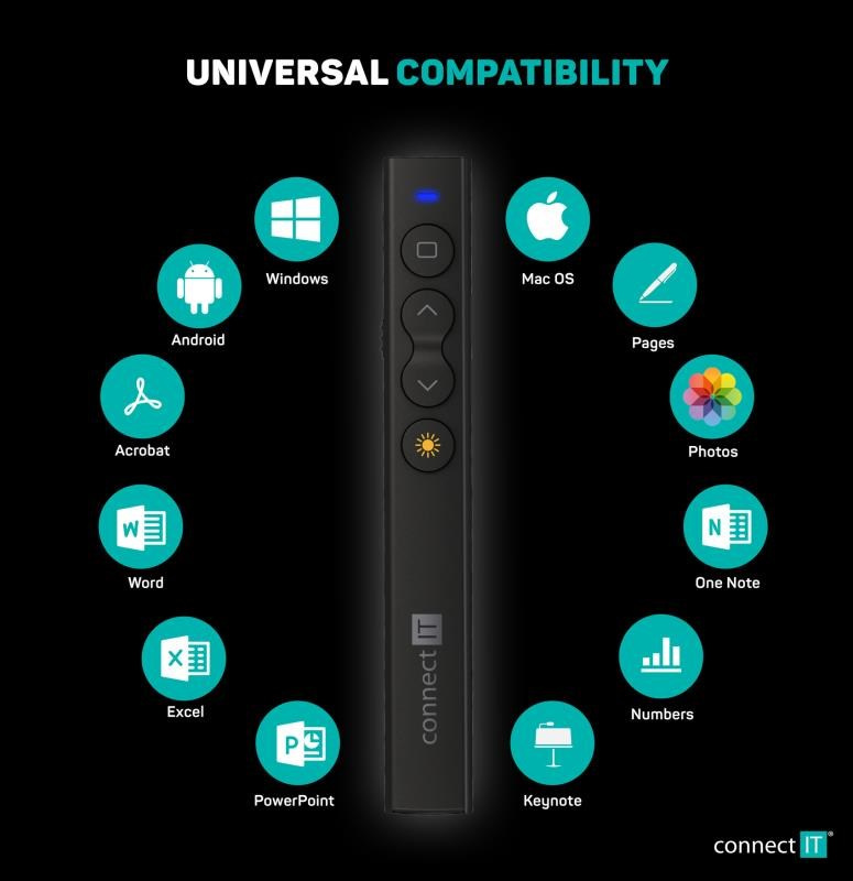 | Funkce prezentéru | - TAB/ENTER/ALT+TAB - PAGE UP/FULL SCREEN - PAGE DOWN/BLACK SCREEN - VOLUME UP/PLAY/PAUSE - VOLUME DOWN/NEXT/PREVIOUS |