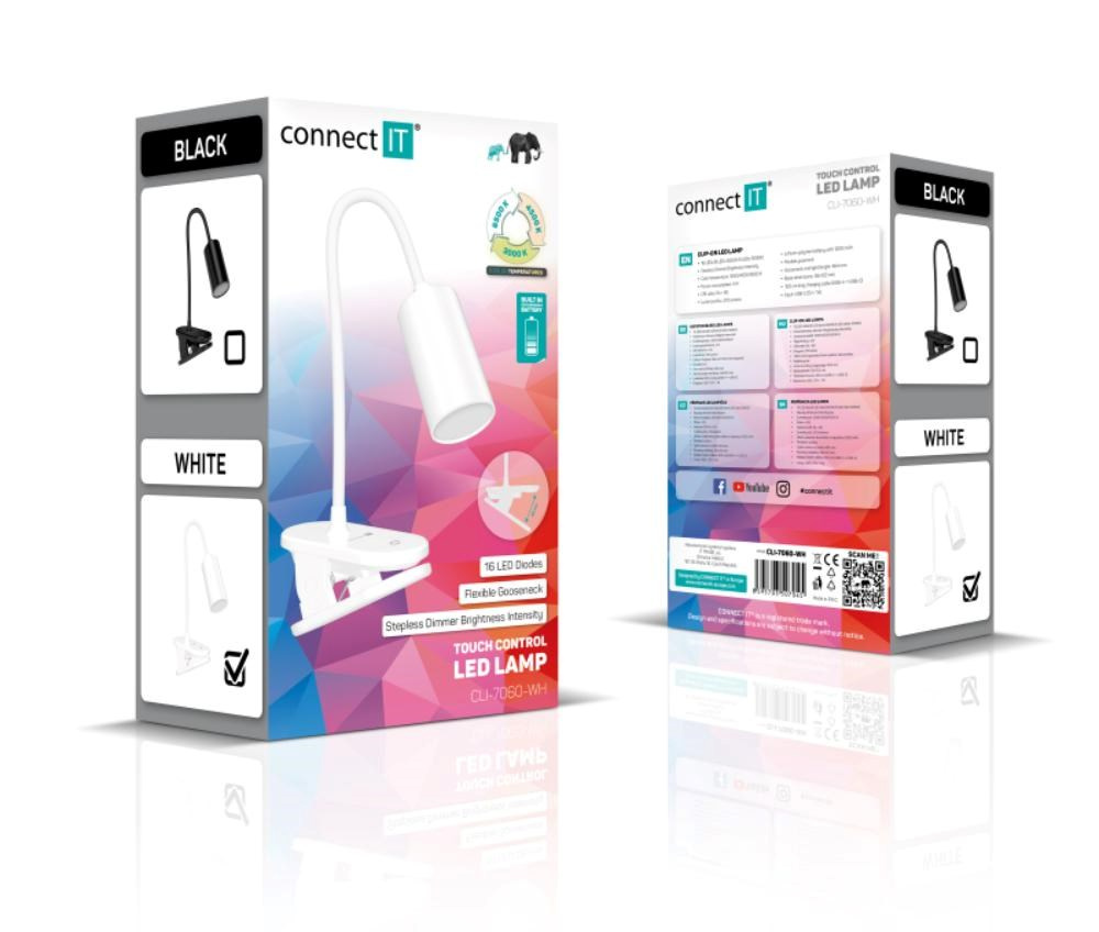 Díky flexibilnímu rameni nastavíte dokonalý úhel pro jakoukoliv práci. Lampička disponuje praktickým dotykovým spínačem, který umožňuje zapnout/vypnout lampu, plynule nastavit úroveň jasu světla nebo nastavit barevnou teplotu světla ve 3 různých úrovních (3000/4500/6500 K). Pomocí klipu můžete lampičku umístit nejen na Váš pracovní stůl, ale například na poličku, noční stolek či rám postele.
