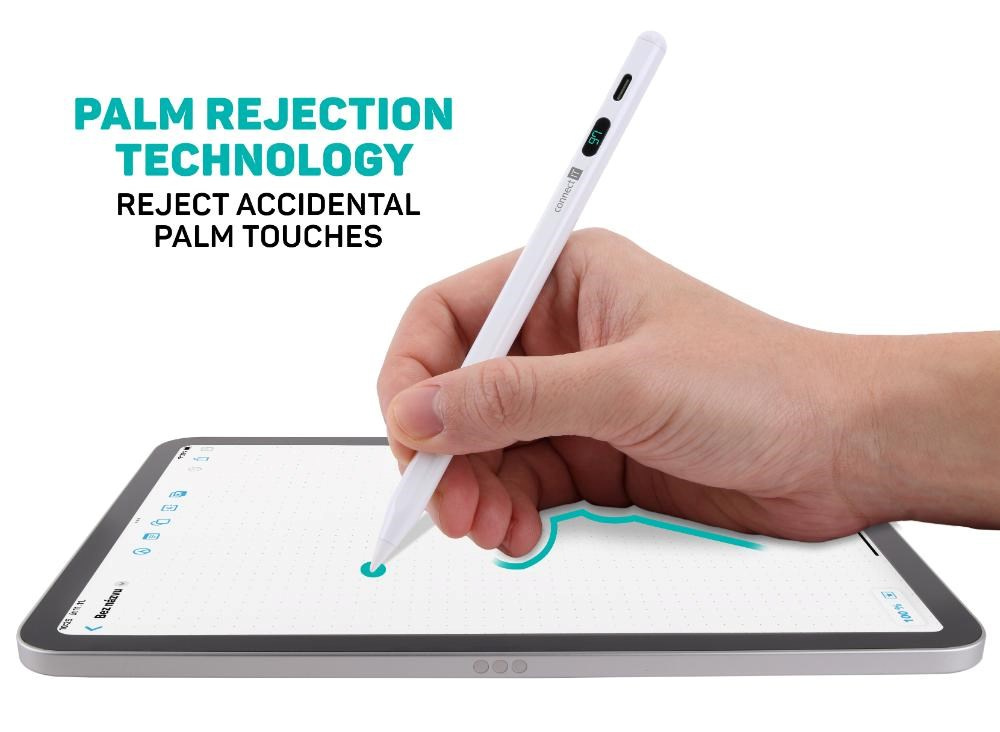 TouchPen disponuje technologií "Palm Rejection", která umožňuje psát a kreslit na dotykovém displeji tabletu s opřenou rukou, aniž by tato ruka zanechávala nežádoucí čáry nebo znaky. Technologie je navržena tak, aby automaticky ignorovala dotyky dlaně, zatímco zaznamenává dotyky a příkazy dotykového pera. Inteligentní hrot umožní snadnou úpravu a regulaci tloušťky čar pouhým nakloněním pera. Díky LED displeji budete mít vždy dokonalý přehled o stavu baterie. Balení obsahuje jeden vyměnitelný hrot navíc pro případnou výměnu.