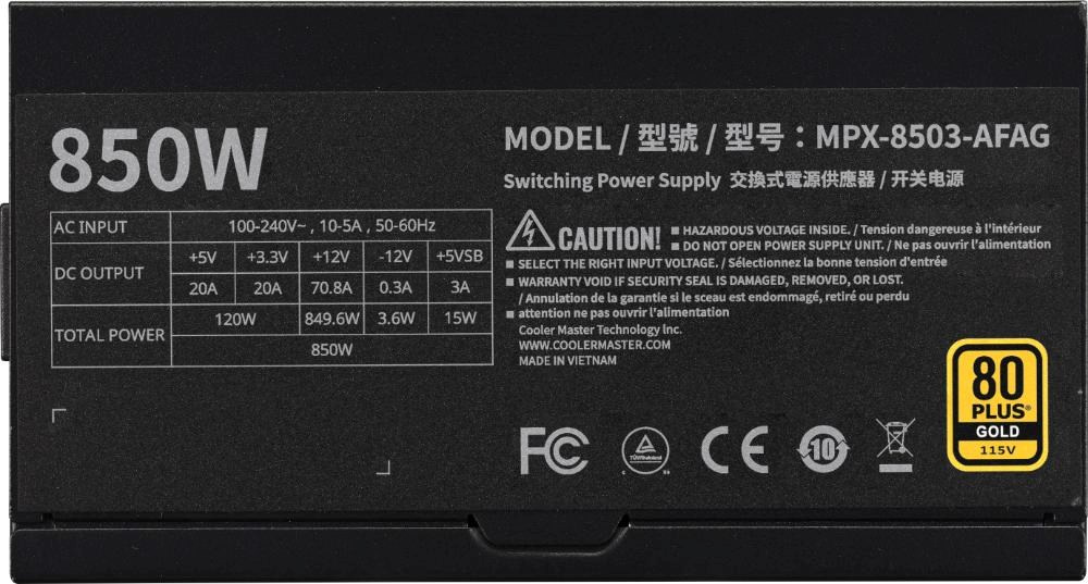 Popis Cooler Master zdroj 850W MWE Gold 3, 120mm, 80+ Gold, Plně modulární, ATX 3.1