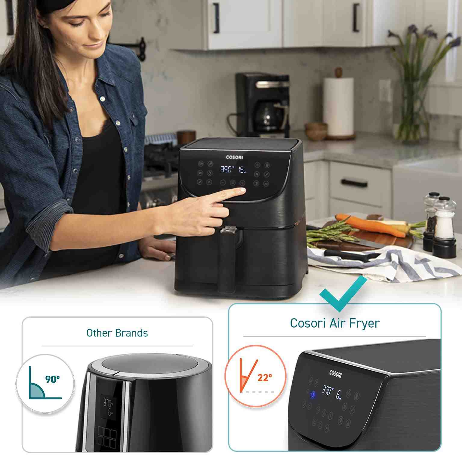 Design horkovzdušné fritézy COSORI CP158-AF byl navržen v Kalifornii. Díky své praktičnosti, funkcím, ovládání i přehlednému dotykovému nakloněnému LED displeji se snadno přístupnými tlačítky získal také prestižní ocenění Red Dot Award a Design Award za nejlepší design. Povrchová úprava je navíc odolná vůči otiskům prstů, takže fritéza bude ve vaší kuchyni vypadat pořád skvěle. Podle prodejních statistik je značka COSORI také nejprodávanější značkou horkovzdušných fritéz v USA.