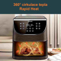 Horký vzduch rotuje kolem jídla ze všech stran a tím dosahuje kvalitního a rovnoměrného propečení a uvaření pokrmů. Díky této technologii se fritéza předehřeje během pouhých 5 minut.