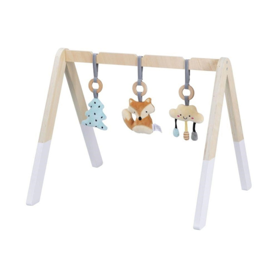 Dřevěná dětská hrazdička se závěsnými hračkami v podobě roztomilé lištičky, stromečku a obláčku upoutá pozornost každého miminka. Dětská hrazdička v neutrálních barvách, vhodná pro holčičky i chlapce, stimuluje dětské smysly, motivuje miminka k pohybu a prozkoumání závěsných prvků. Každou z měkkých hraček můžete z dřevěné hrazdičky sundat a použít jako samostatné hračky..