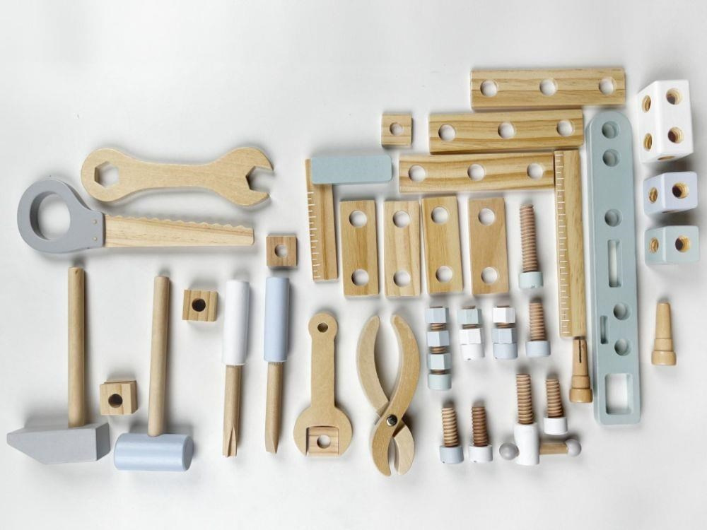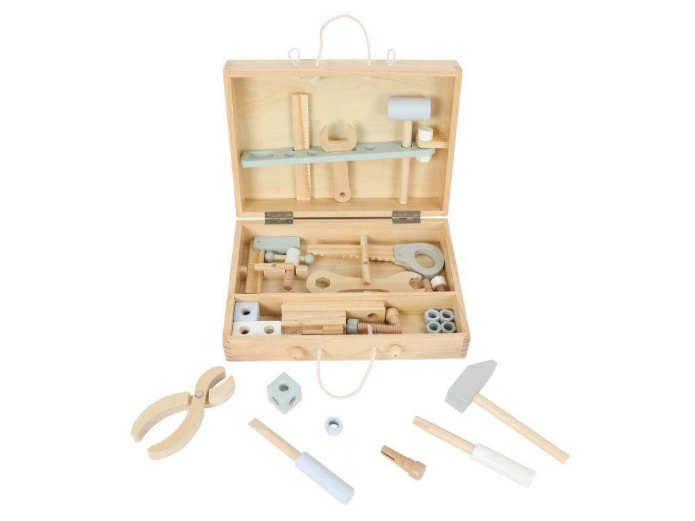 Dřevěné nářadí krásně a přehledně uložené v praktickém dřevěném kufříku nadchne každého malé kutila. Uvnitř kufříku najdou děti nejdůležitější nástroje včetně šroubů, matek a dalších doplňků. Kufřík s poutkem a členěným vnitřním prostorem usnadní dětem úklid i přenášení oblíbené hračky, děti tak mohou mít svou opravářskou a kutilskou sadu stále s sebou, na dovolené, na víkend k babičce..