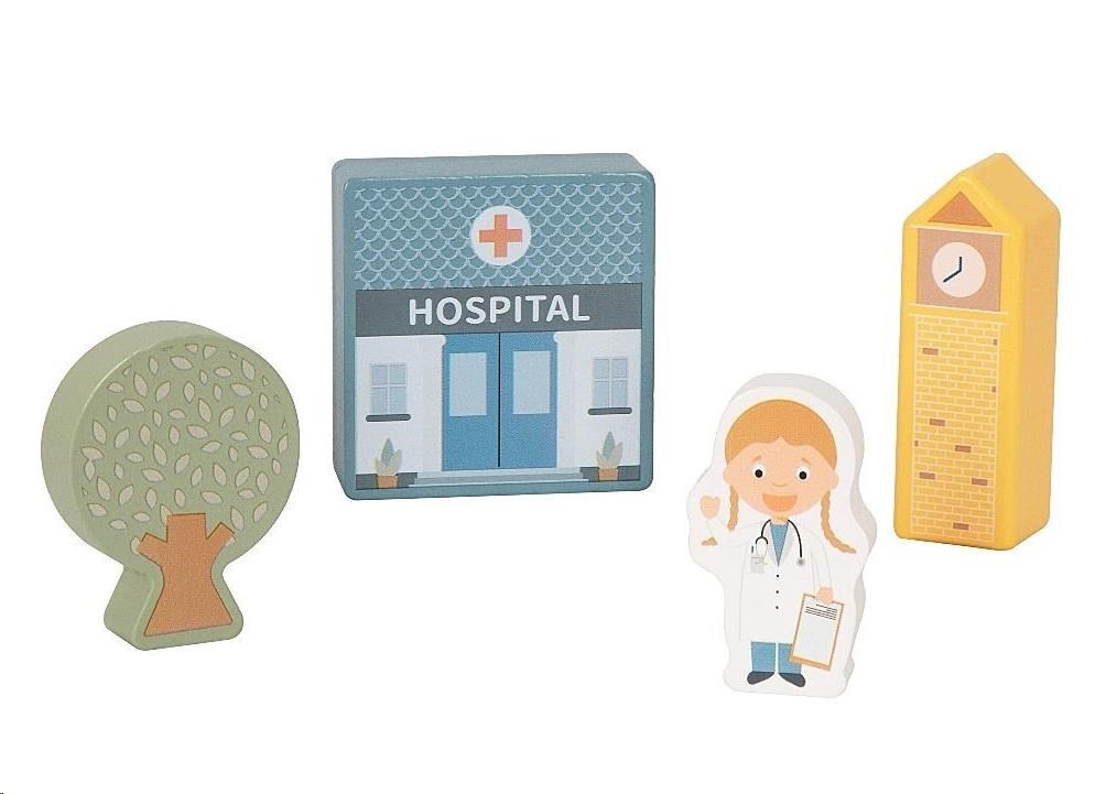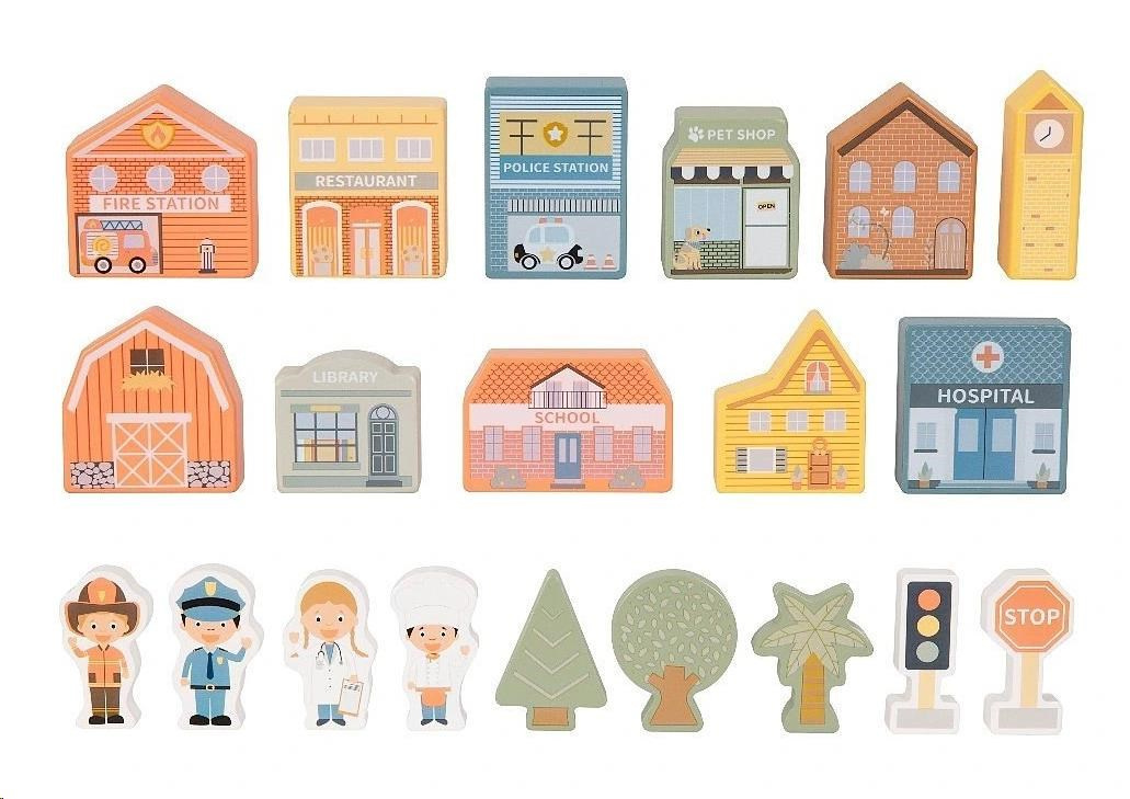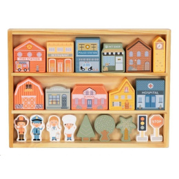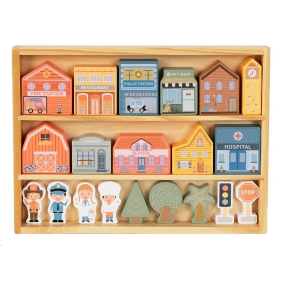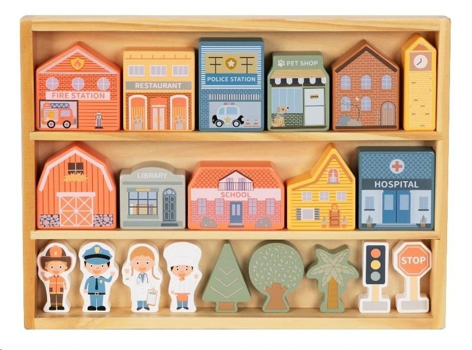 Dřevěné kostky patří mezi nejoblíbenější dřevěné hračky. S kostkami mohou děti popustit uzdu své fantazii, hrát si a stavět cesty, domečky i celá města. S dřevěnými kostkami město vybudují děti úžasné město s nemocnicí, policejní a hasičskou stanicí, se školou, knihovnou, obchůdky, obytnými domy a věčně zelenými stromy raz dva. Na dodržování pořádku dohlédne postavička policisty, o nemocné se postará pan doktor a pro případ požáru ve městě nechybí ani další hrdina - hasič. Dřevěné kostky krásné uložené v praktické krabičce si děti snadno přenesou na místo, kde si s nimi chtějí hrát, mohou si je vzít s sebou na návštěvu, na víkend k babičce i na dovolenou.