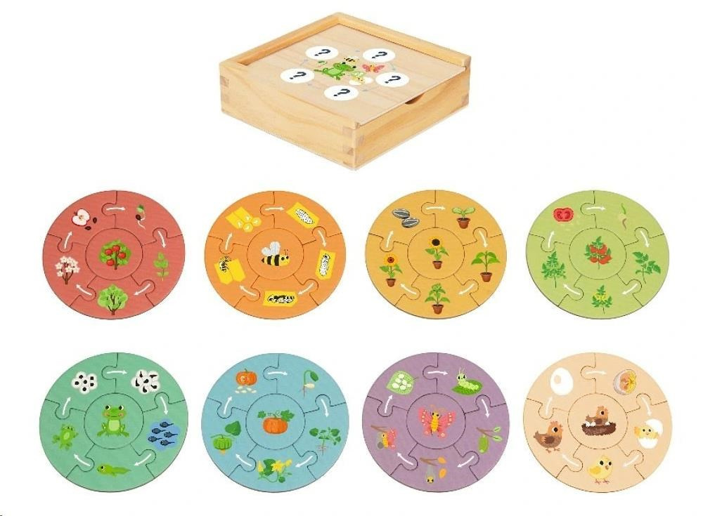 Dřevěné puzzle s originálním motivem cyklu života rostlin i zvířátek bude úžasnou hračkou pro děti od 3 let. Osm kruhových puzzle skládaček se šesti díly děti seznámí s podobou rostlin a zvířátek, od samého počátku až po jejich zralost a dospělost. Vše, co se děti při skládání naučí, spolu můžete později pozorovat venku, například při procházce, na zahradě nebo na prázdninách u babičky. Děti pochopí princip stárnutí a koloběh života nejen včelky, žabky, motýlka, ptáčka, slunečnice, jabloně, dýně a rajčete, ale začnou si všímat změn rostlin a zvířat ve svém okolí.