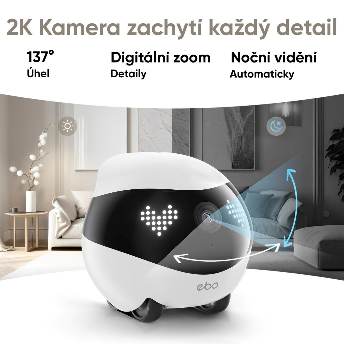 • 2K kamera s širokým úhlem záběru – zajišťuje čistý a detailní obraz, ideální pro kontrolu domácnosti, dětí nebo mazlíčků.
