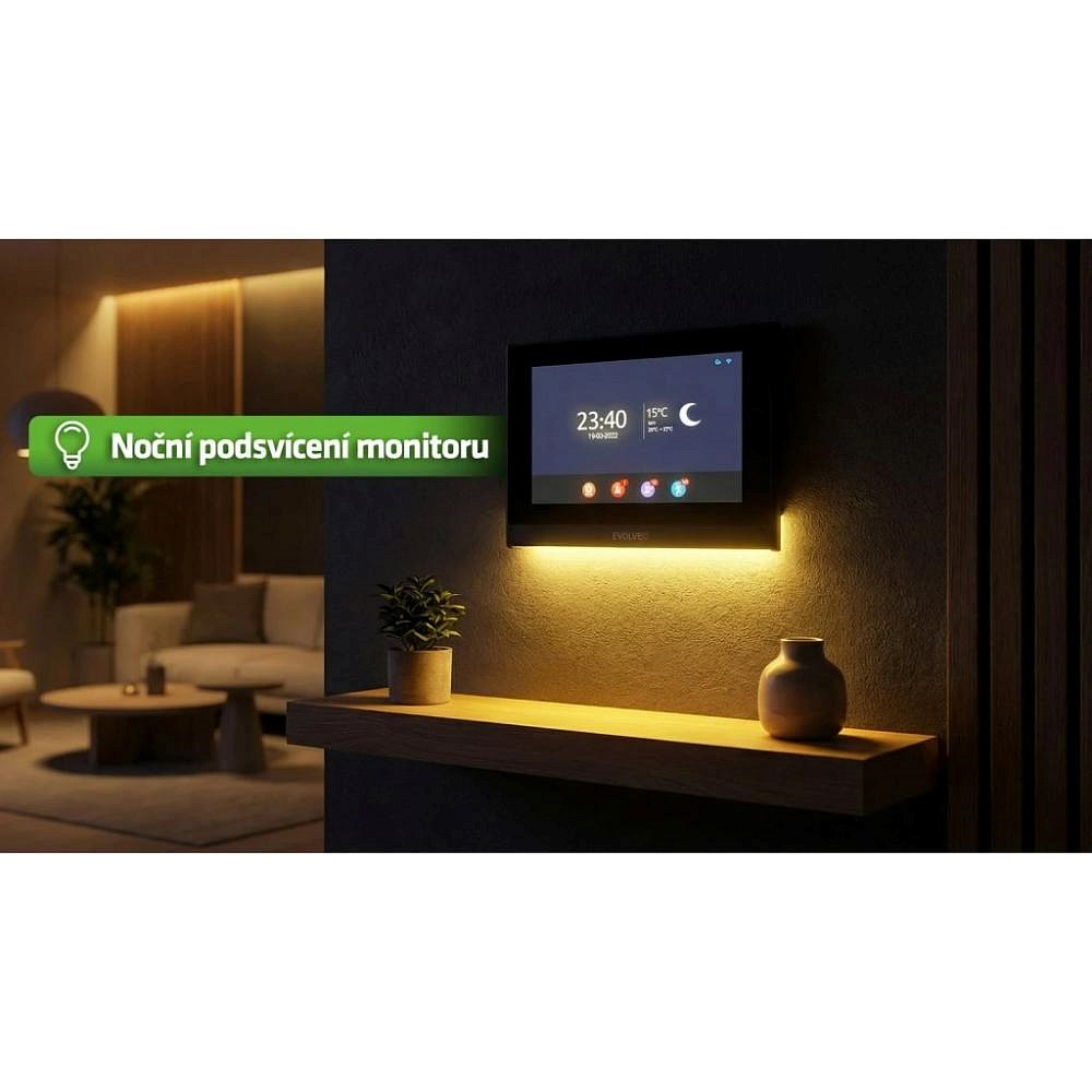DoorPhone ID2 není jen funkční zařízení, ale i designový prvek. Monitor je vybaven jemným oranžovým downlight podsvícením na spodní straně, které funguje jako tlumené orientační světlo. V noci, když jdete pro vodu nebo kontrolujete chodbu, nemusíte rozsvěcet hlavní osvětlení. Jemná teplá záře vytvoří příjemnou atmosféru a zároveň zajistí bezpečný pohyb.