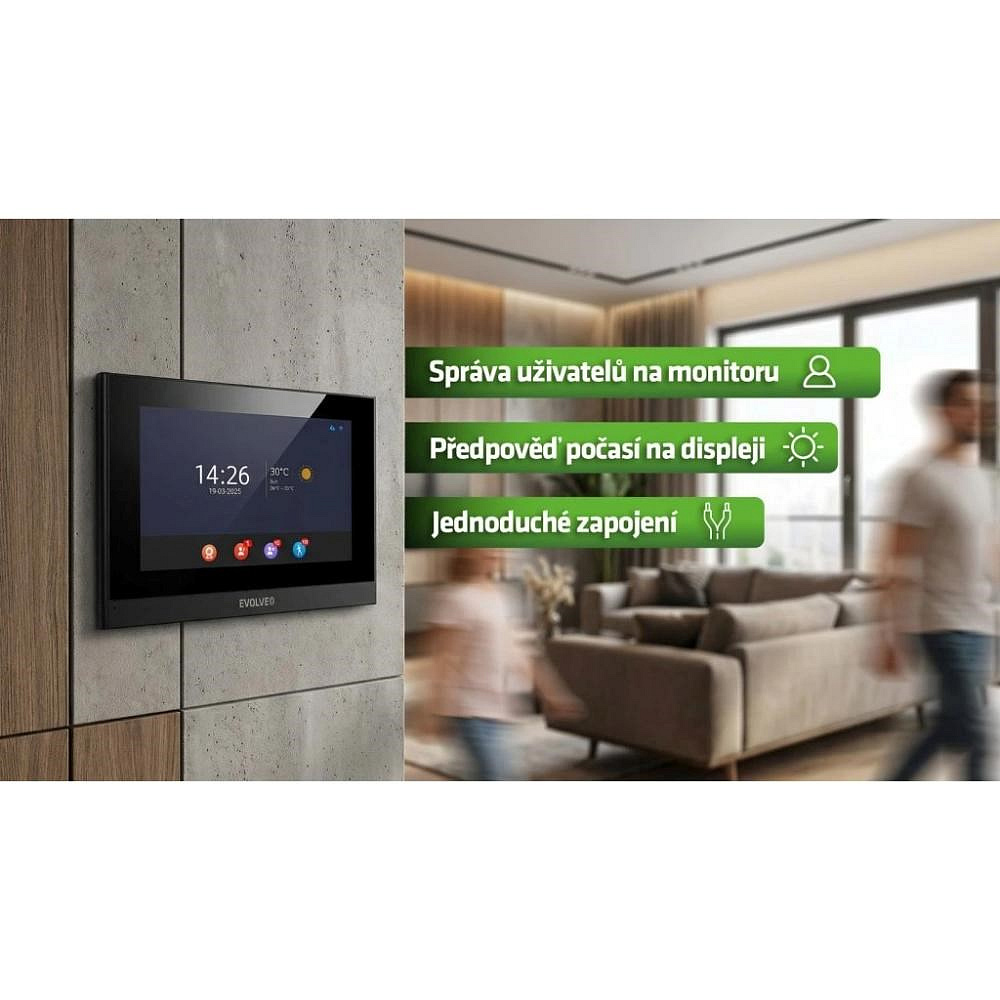 Monitor může zároveň sloužit jako digitální fotorámeček. V pohotovostním režimu zobrazuje fotografie uložené na microSD kartě a přirozeně tak zapadne do interiéru. Nepůsobí jako technický panel, ale jako součást domácnosti. Rozhraní je přehledné a intuitivní, správa uživatelů i přístupových práv probíhá přímo na displeji během několika kroků.