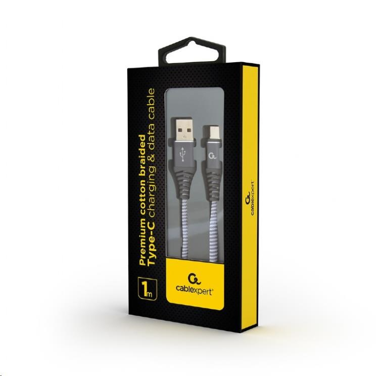 Premium cotton braided Type-C USB charging and data cable, 1 m, silver/white
