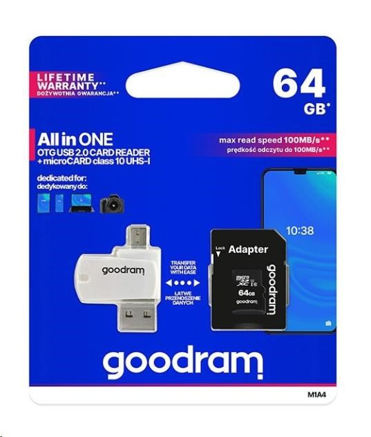 GOODRAM M1A4 All in One poskytuje všestrannost tím, že poskytuje funkčnost několika zařízení v jednom řešení. Jedná se o čtečku karet vybavenou konektory USB 2.0 a micro USB, umožňující snadný přenos dat mezi počítači, smartphony, tablety a fotoaparáty. Dodává se s rychlou UHS-I microSD kartou.