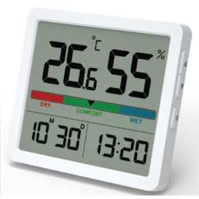 Měření vnitřní teploty a relativní vlhkosti. Tři barevně odlišené stupně indikace tepelné pohody (komfortu). Zobrazení času a data s manuálním nastavením. Čas ve formátu 12, nebo 24 hodin. Možnost postavení, nebo přichycení na kovový podklad pomocí vestavěného magnetu. Možnost přichycení na nekovový povrch samolepící páskou s plátkem kovu.